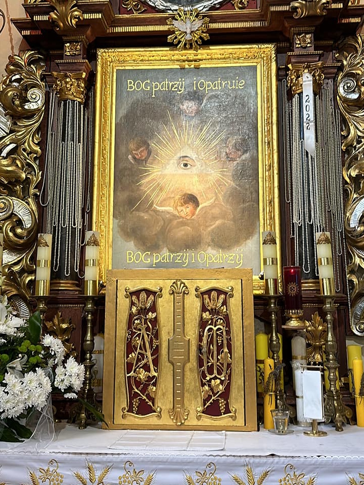 Przedstawia Oko Opatrzności wpisane w trójkąt – symbol Trójcy Świętej – otoczone promieniami i obłokami. Wśród obłoków widoczne są cztery anioły, których twarze i skrzydła dopełniają kompozycję. Szczególną wymowę nadają dziełu polskie napisy: u góry – BÓG patrżӱ i opatruie, u dołu – Bóg patrżӱ i opatrżӱ, świadczące o silnym przywiązaniu Warmiaków do wiary i ojczystej kultury w XVIII wieku.