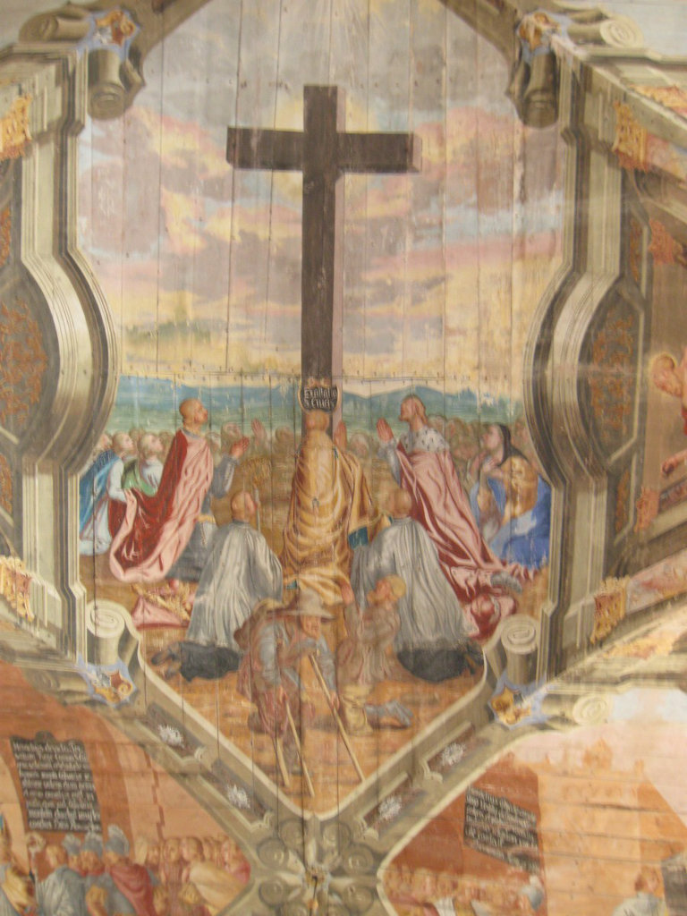 Czternaście scen z Legendy Krzyża Świętego można obejrzeć na przepięknych polichromiach pokrywających drewniane sklepienie świątyni.
