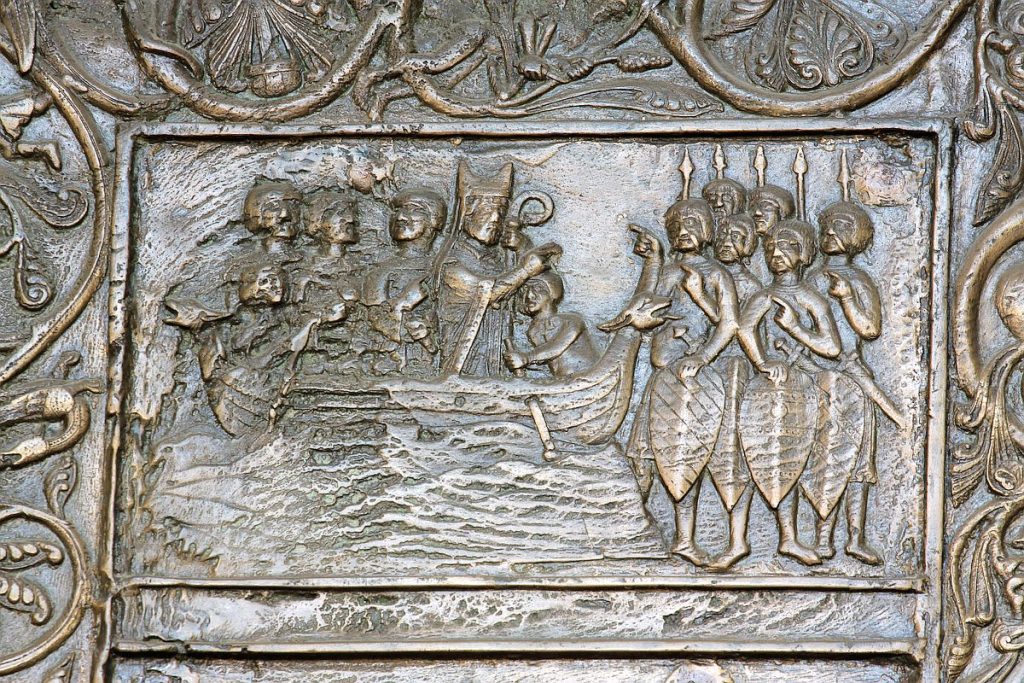 Św. Wojciech przybywa do Prus – jedna ze scen z tzw. Drzwi Gnieźnieńskich. (fot. Internet)