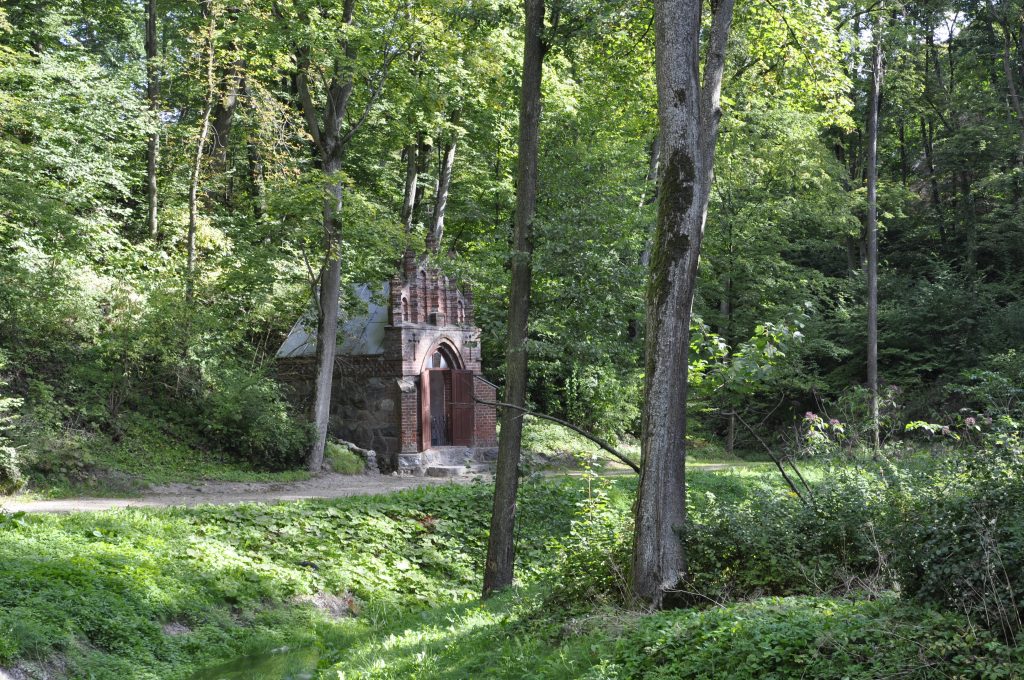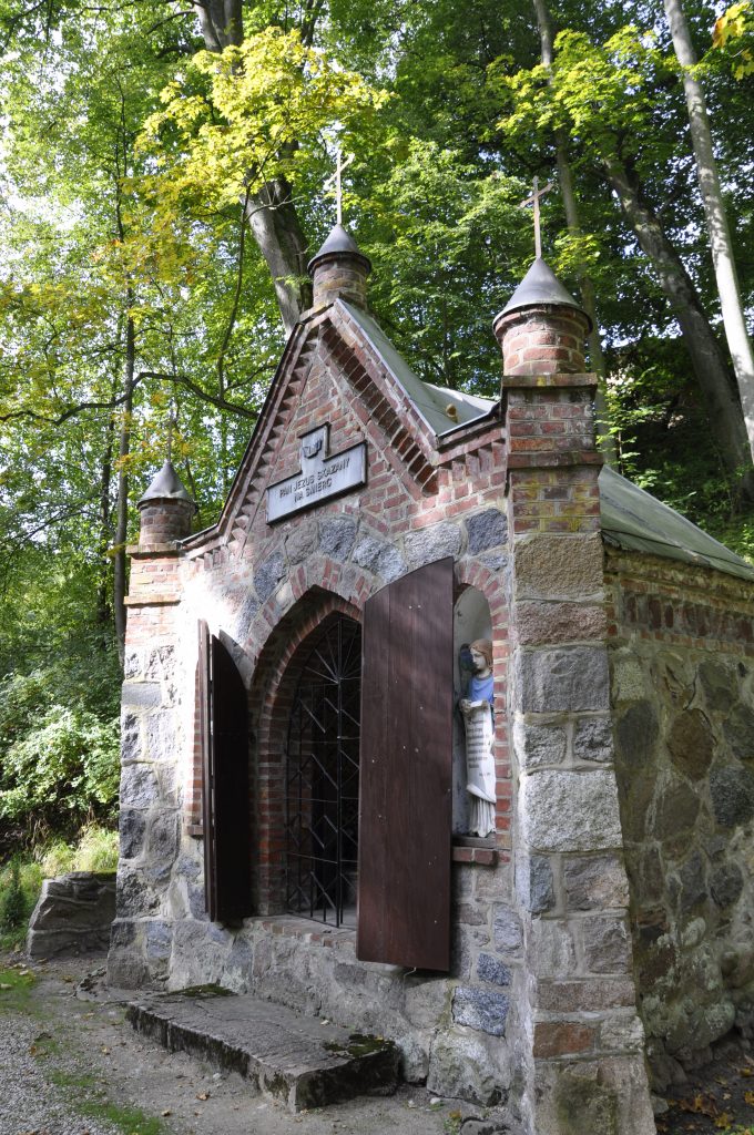 Szlak pielgrzymkowy wyznacza tu główna aleja parku. Przy niej znajduje się czternaście neoromańskich i neogotyckich kapliczek-stacji Męki Pańskiej. Wszystkie domkowe, murowane z cegły. Ustawione przeważnie na rzucie kwadratu i prostokąta, a także ośmiokąta. W swoich architektonicznych rozwiązaniach przypominają małe kościółki.