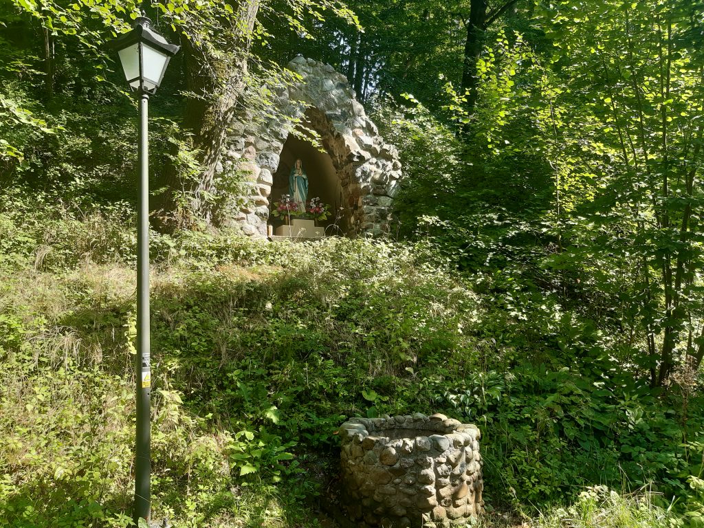 Oprócz czternastu stacji Drogi Krzyżowej w okresie międzywojennym zbudowano tu także kaplicę Modlitwy Pana Jezusa w Ogrójcu oraz widoczną na zdjęciu grotę Matki Bożej z Lourdes ze źródełkiem, którego woda ma mieć niezwykłe właściwości. (fot.KM)