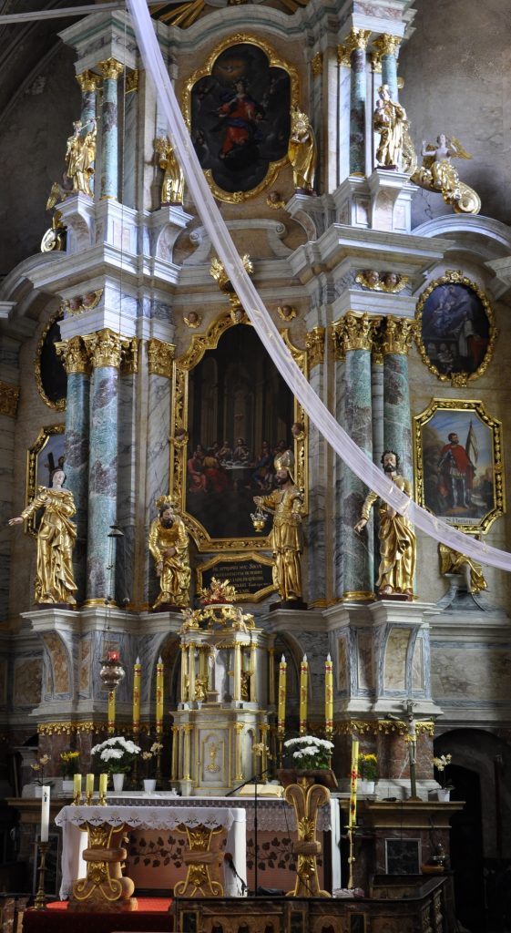 XVIII-wieczny ołtarz główny kościoła w Głotowie z obrazem przedstawiającym Ostatnią Wieczerzę i, powyżej, z obrazem Maryi Wniebowziętej. (fot. KM)