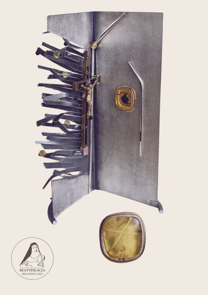 Na środku, niczym okno witrażowe, umieszczona została puszka relikwiarzowa. […] Została wykonana z dwu, już współcześnie noszonych przez siostry, medalionów. Wybrane zostały losowo z pozostałych i przechowywanych po zmarłych siostrach. Z innych medalionów wykonano również niektóre elementy relikwiarza. W ten sposób akcentując więź kolejnych pokoleń, ciągłość powołań, ze wskazaniem na łączący je przekaz emocjonalny. Puszka została pozłocona złotem w kolorze czerwonym, podkreślając męczeńską śmierć sióstr. Jest dodatkowo otoczona złotym (złoto wotywne) obramowaniem. Półokrągły przekrój tego złotego obramowania jest identyczny z tym, z jakiego wykonuje się klasyczne obrączki, to nawiązanie do pozostania w wierności składanym ślubom przez beatyfikowane siostry. Wewnątrz puszki, na złotej płytce (złoto wotywne), po jednej stronie umieszczone zostały fragmenty habitów beatyfikowanych sióstr, po drugiej pieczęć postulatorki procesu beatyfikacyjnego, poświadczająca prawdziwość tych relikwii. Relikwie znajdują się za przeźroczystą, wykonaną z wyselekcjonowanego, naturalnego bursztynu bałtyckiego, płytką. Są niczym inkluzje zamknięte w bursztynie, zanurzone w nim niczym pojemniku pełnym łez[23].