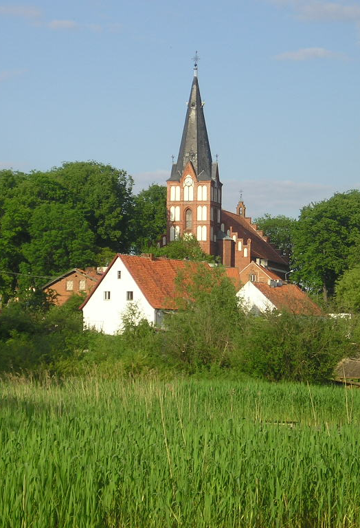 Pierwszy kościół wzniesiono tu na początku XV wieku, kolejny powstał w roku 1581. Konsekrujący go biskup warmiński Marcin Kromer nadał mu wtedy podwójne wezwanie: Znalezienia Krzyża Świętego i Nawiedzenia Najświętszej Marii Panny. Neogotycka trójnawowa budowla z czerwonej cegły, znajdująca się obecnie na jego miejscu, wzniesiona została w latach 1891-1892, według projektu Fritza Heitmanna, architekta z Królewca. Jej ponownej konsekracji dokonał 21 września 1896 roku biskup warmiński Andrzej Thiel. Do wcześniejszych patronów dodał jeszcze św. Mikołaja.