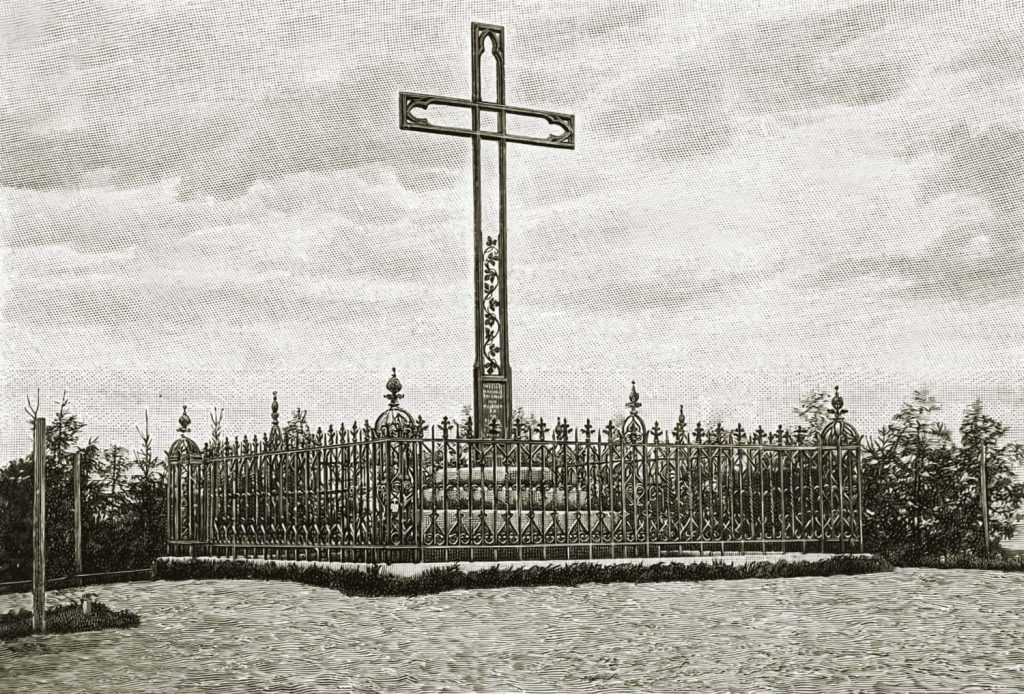 Miejsce symbolicznej śmierci Świętego wskazuje krzyż z tablicą pamiątkową.