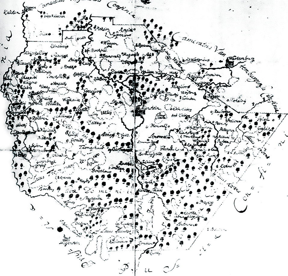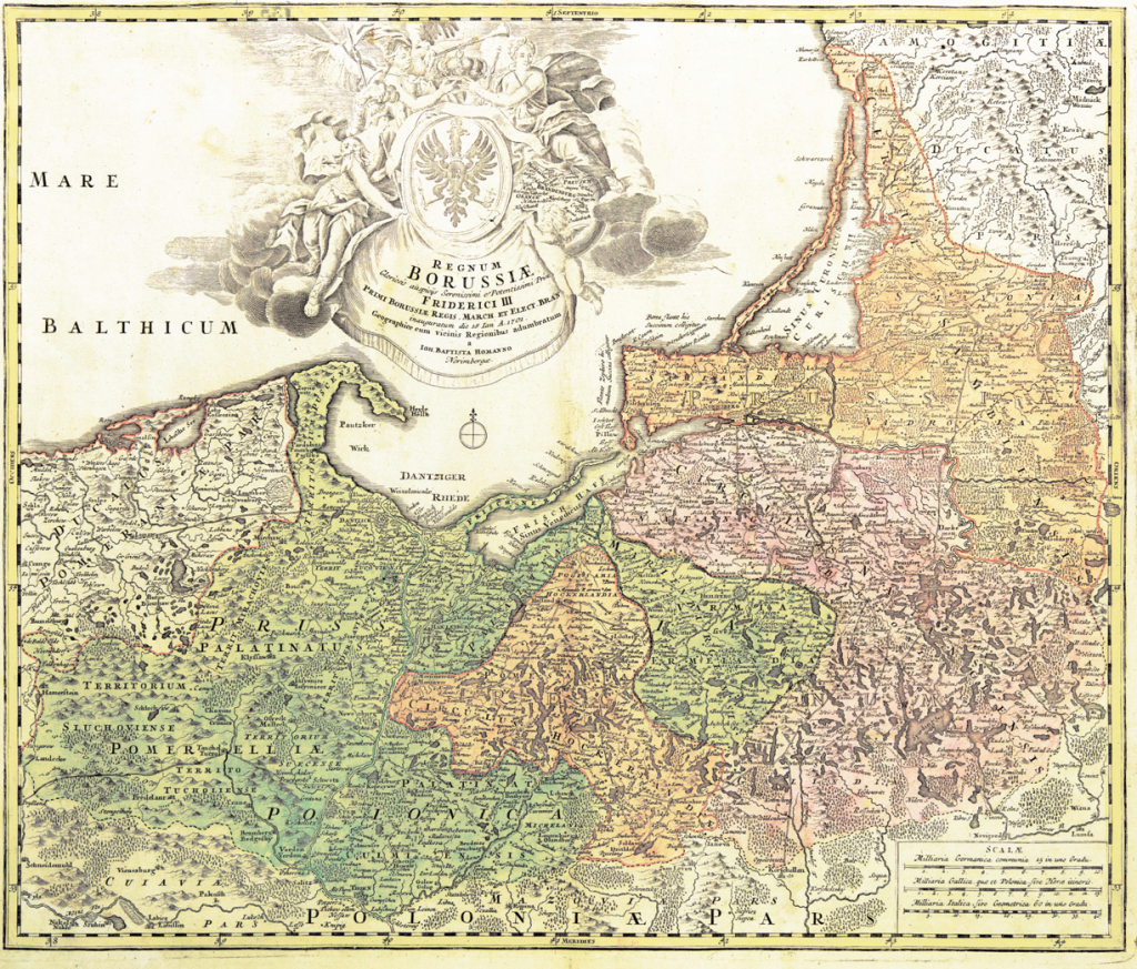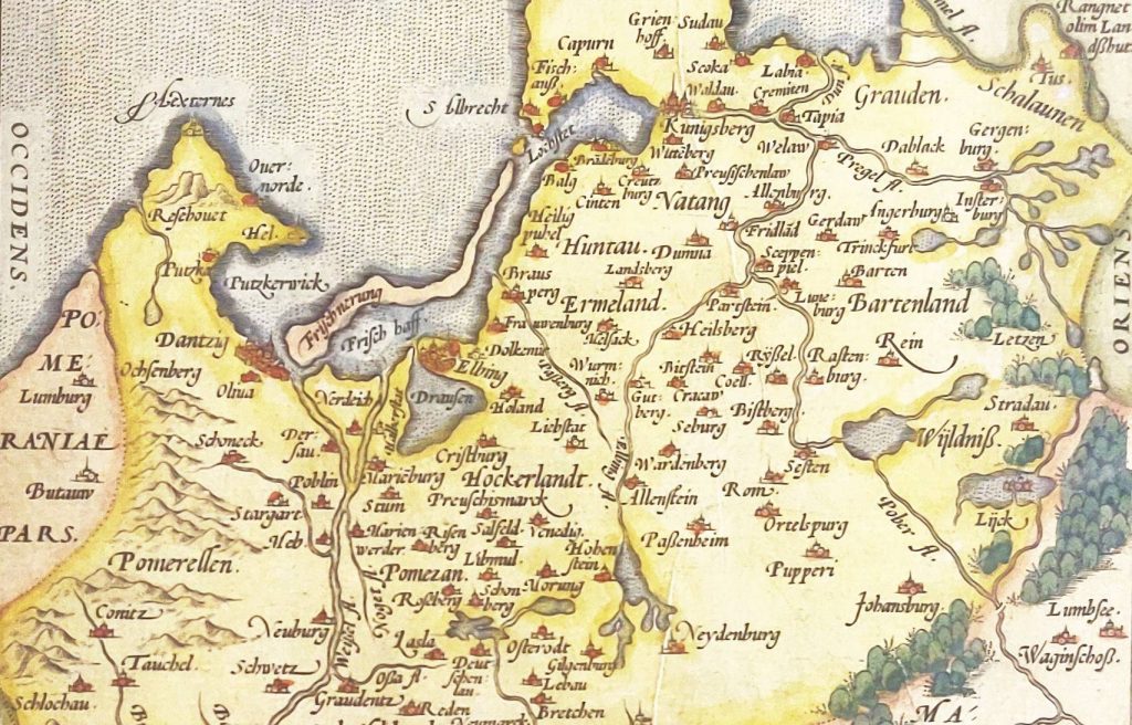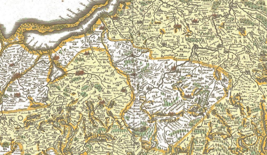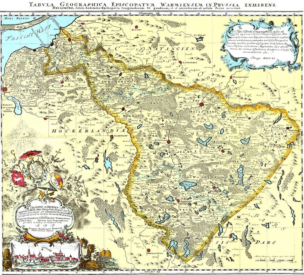 W roku 1576 w Królewcu, jako odbitka drzeworytnicza na czterech arkuszach, ukazała się mapa Prus (Prussiae das ist des Landes zu Preussen…) Caspara Hennebergera (1529-1600), niemieckiego historyka i kartografa związanego z pruskim dworem książęcym w Królewcu. Do połowy XVIII wieku jego karta wykonana w stosunkowo dużej jak na owe czasy skali 1:368 000 była najszczegółowszym obrazem terytorium Warmii, opisanej na niej także jako Ermeland.